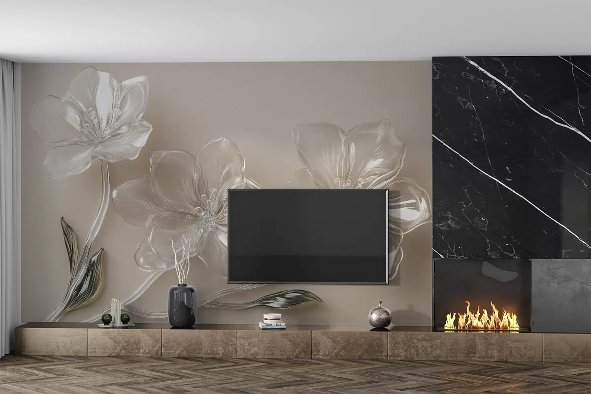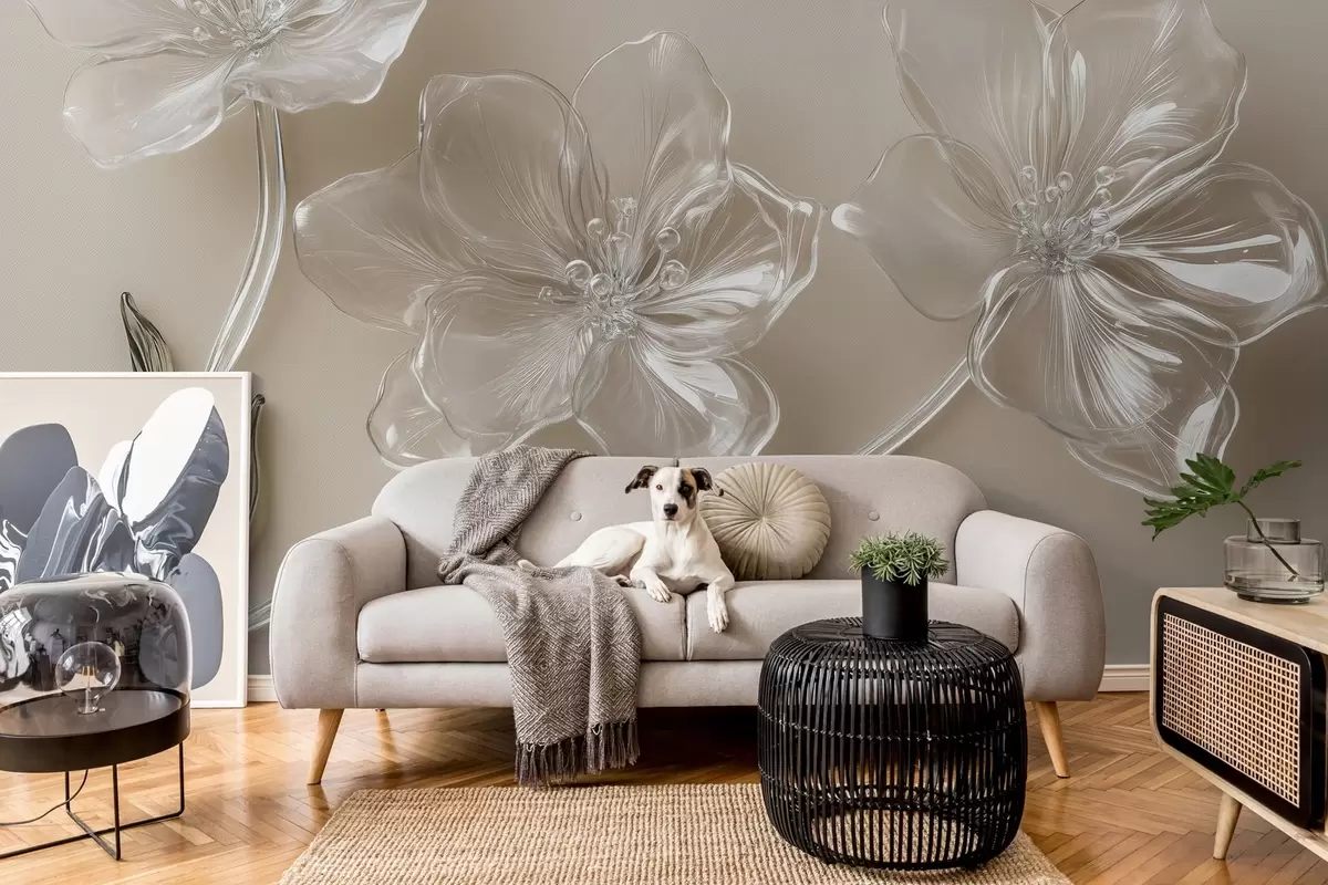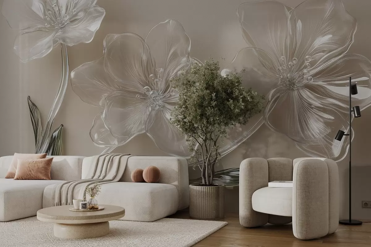 Фотошпалери великі квіти, що імітують скло на бежевому тлі w02518