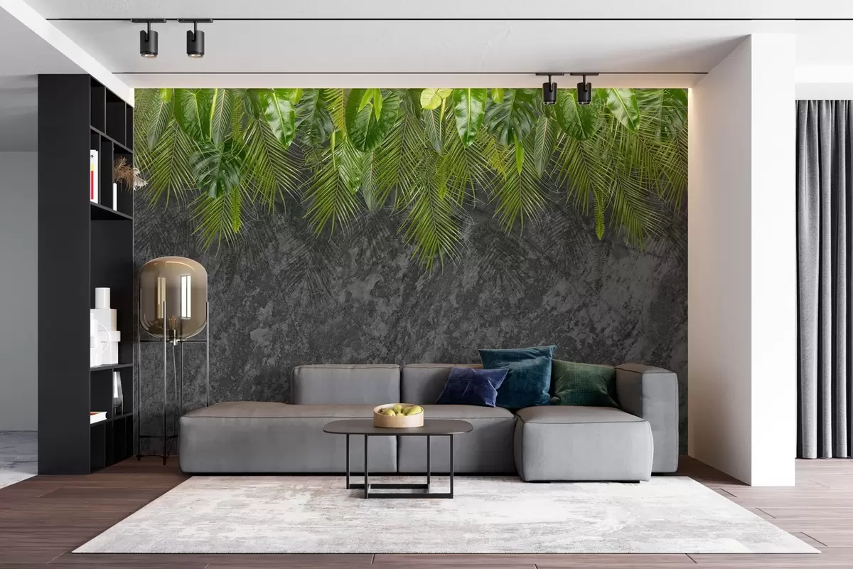 Шпалери тропічне листя на тлі імітації каменю w02547