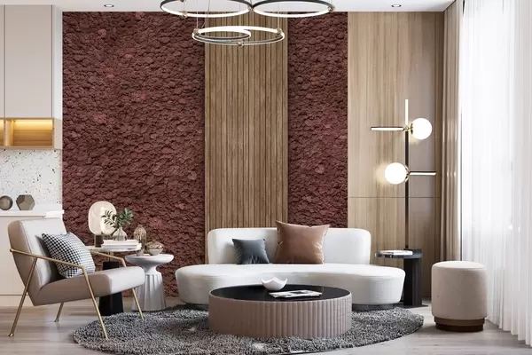 Фотошпалери Стіна в стилі моху з дерев'яною панеллю, соковиті бордові кольори w02656v1