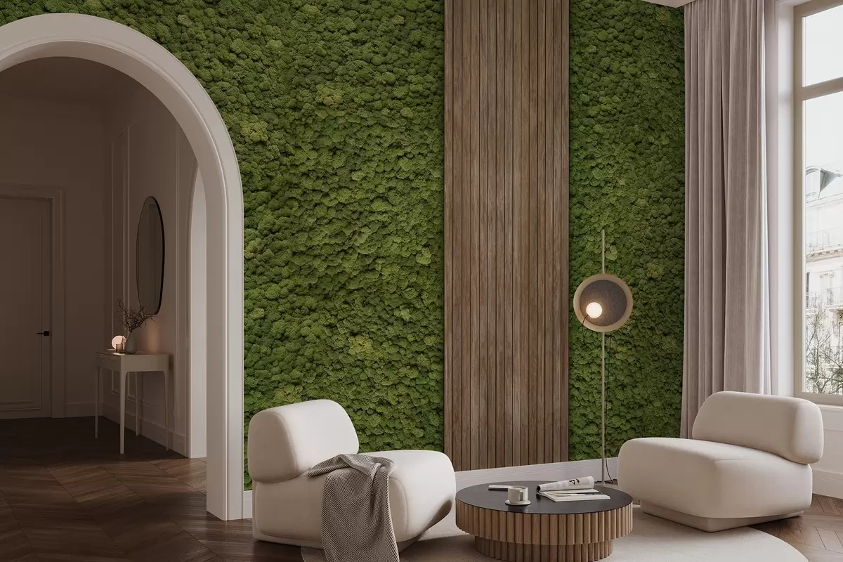 Фотошпалери Стіна в стилі моху з дерев'яною панеллю, соковиті оливкові кольори w02656v3