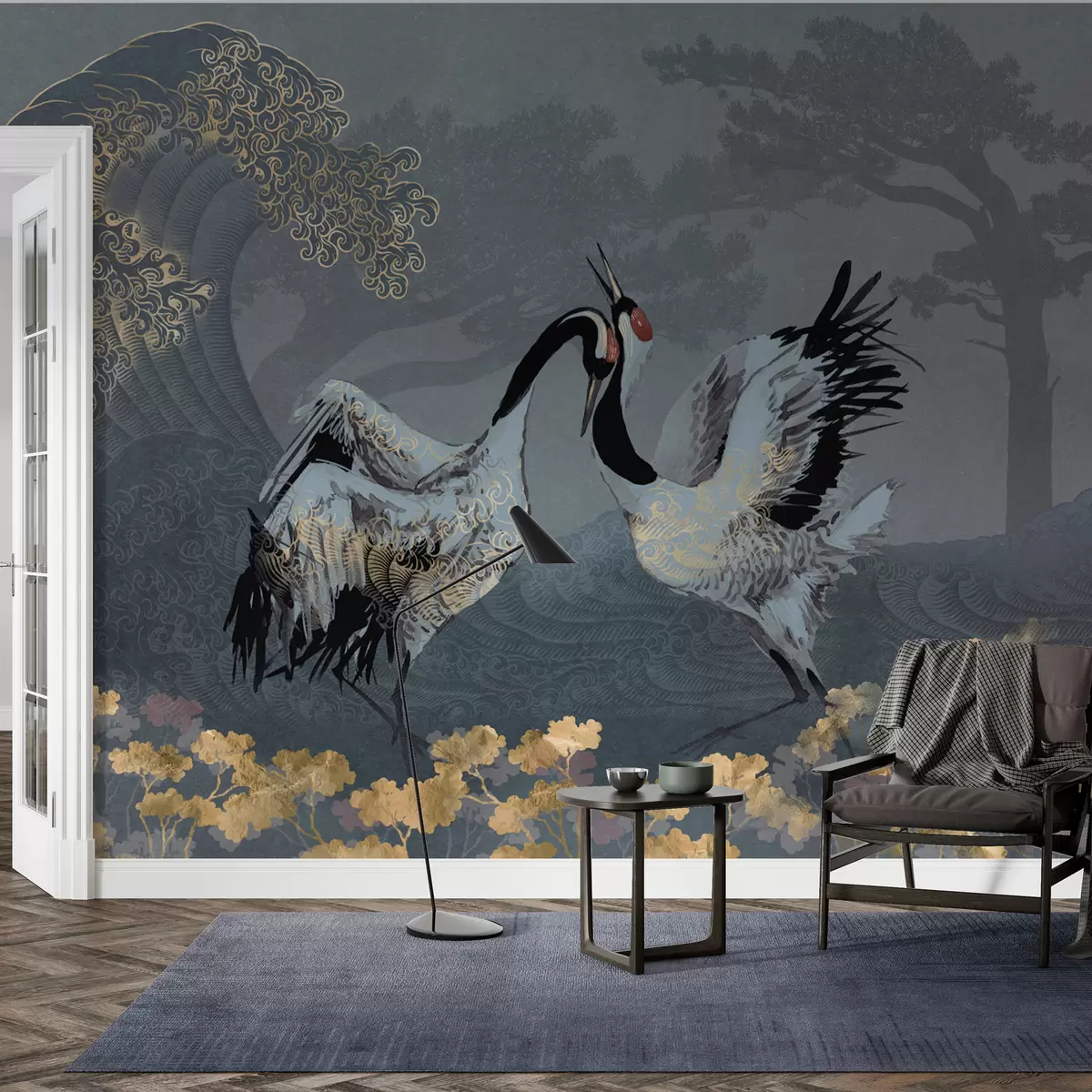 Фотошпалери Журавлі, дерева та хвилі з елементами китайського стилю w02747