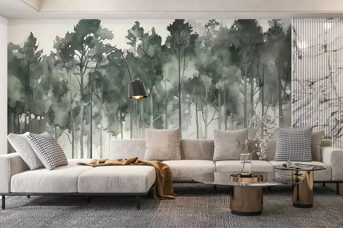 Фотошпалери Акварельний стиль ліс, сосни, природний пейзаж, зелені кольори w02937