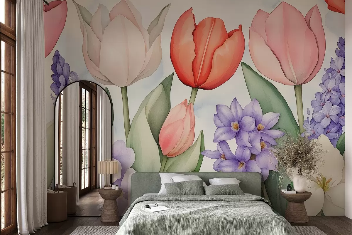 Фотошпалери Весняні квіти, тюльпани, гіацинт, акварельний малюнок, флористика w02940