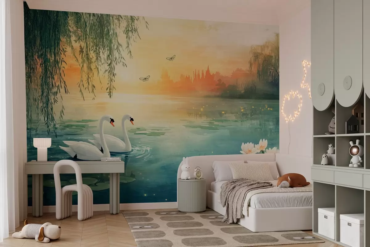 Фотошпалери Романтичний пейзаж в стилі олійного живопису з двома білими лебедями на озері w03017