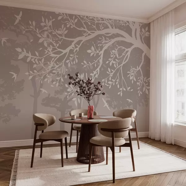 Фотошпалери силует кремової гілки дерева з птахами на тлі лісу w03116