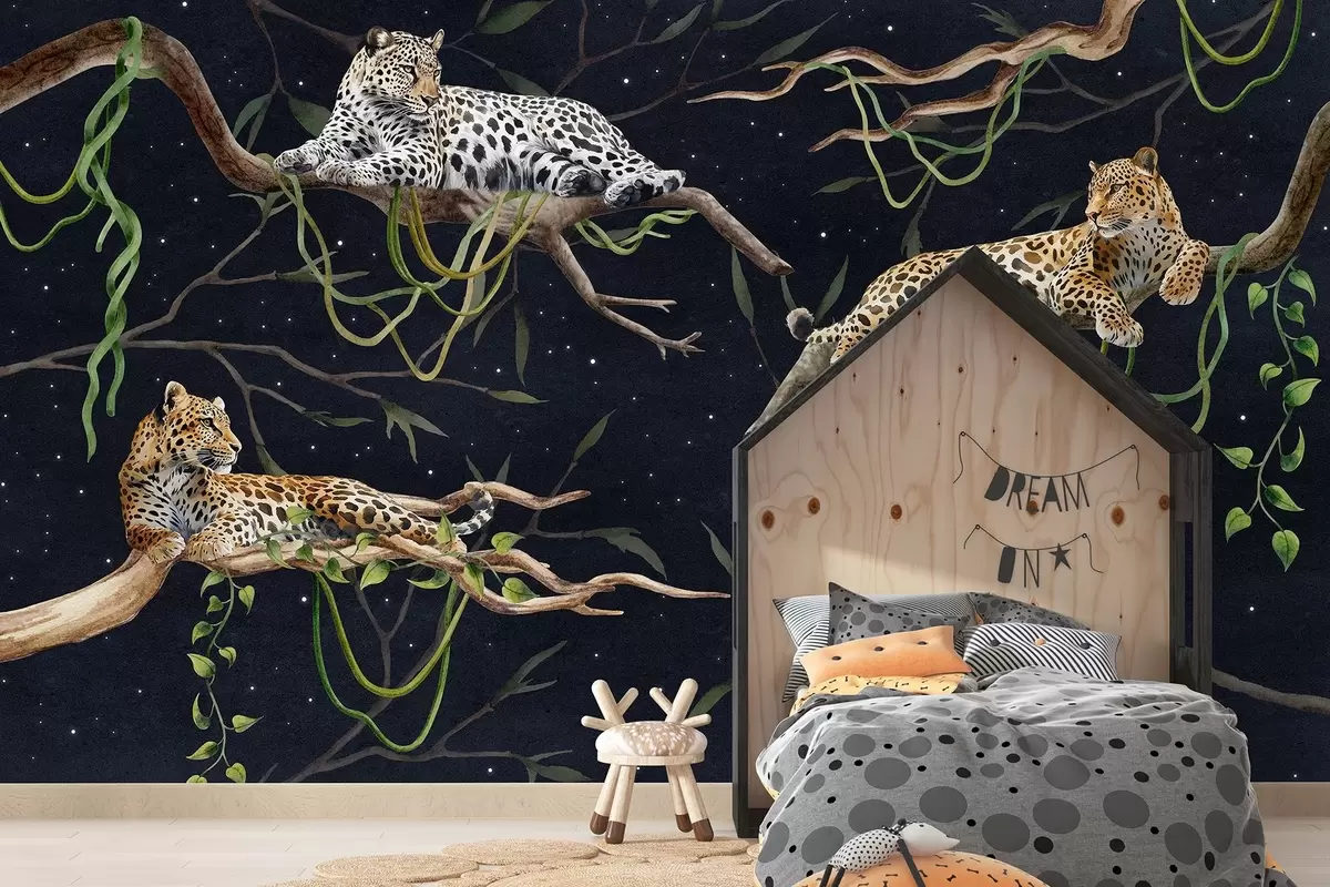 Фотошпалери Леопарди на деревах джунглів, ліани, тропічні, дикі тварини, нічне небо з зірками w03148