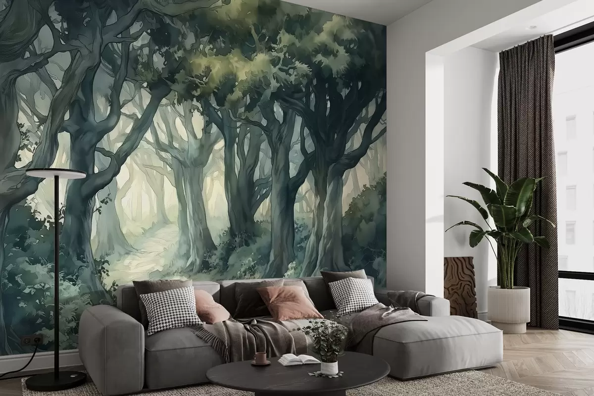Фотошпалери Ліс з великими деревами, зелений колір шпалер, малюнок в стилі акварелі w03150