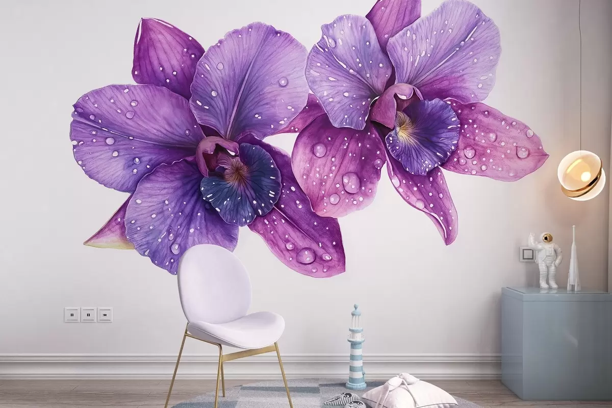 Фотошпалери Красиві квіти орхідеї, акварельний малюнок, фіолетові кольори w03164