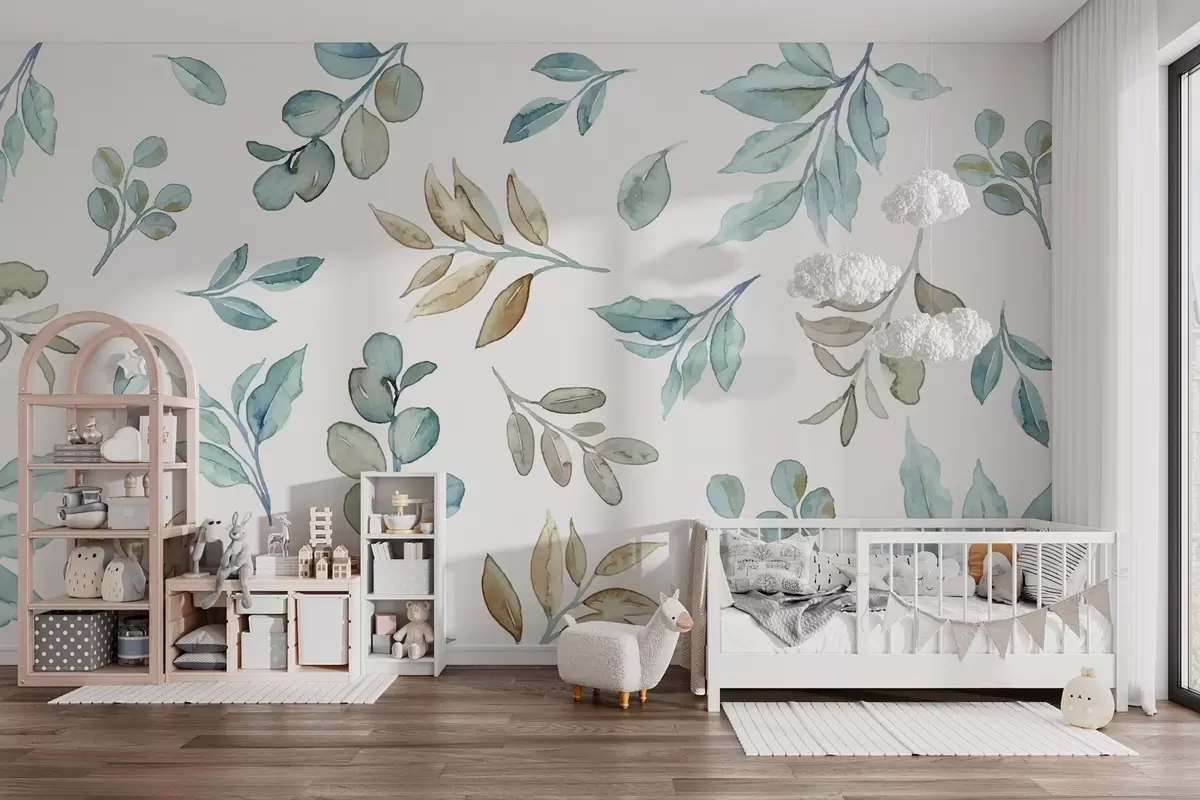 Фотошпалери різноманітне листя та гілки в техніці акварелі в синіх та бежевих тонах на білому тлі w03280
