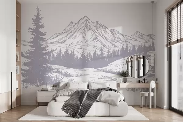 Фотошпалери Гірський пейзаж з соснами, ліс, природа, м'який фіолетовий колір w03344v2