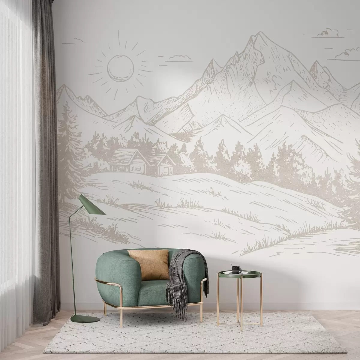 Фотошпалери Малюнок гір, природні пейзажі, ліс, дерев'яні будинки, бежевий колір w03348