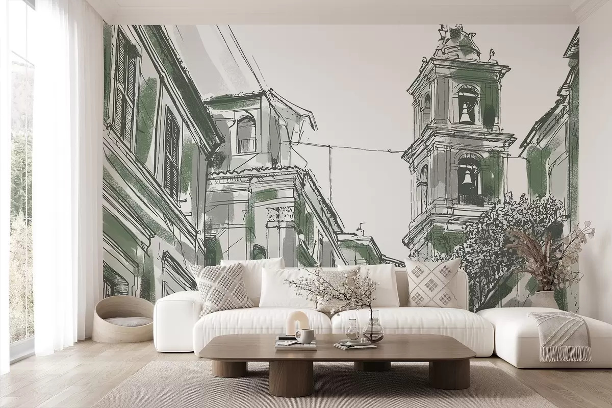 Фотошпалери Вулиця середземноморського міста, каплиця, архітектура, сірий і зелений кольори w03350v2