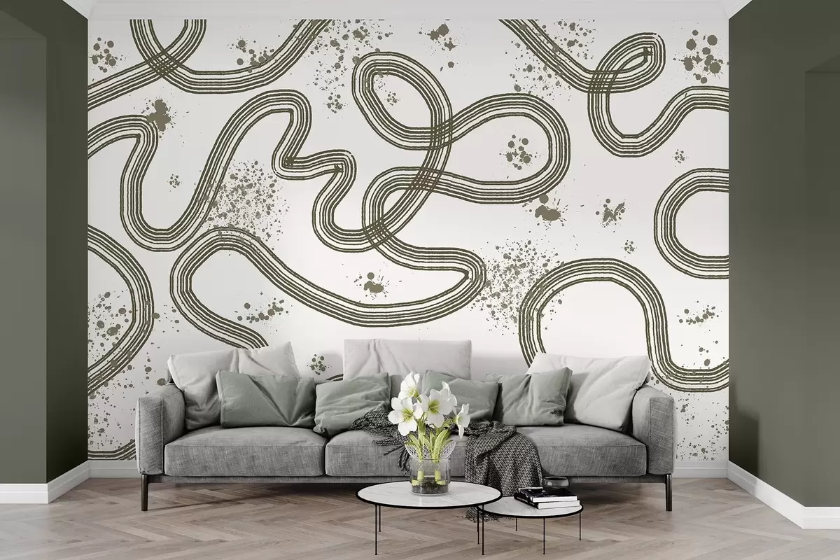 Фотошпалери Лінійний арт-малюнок, бризки фарби, мінімалізм, оливковий колір w03408