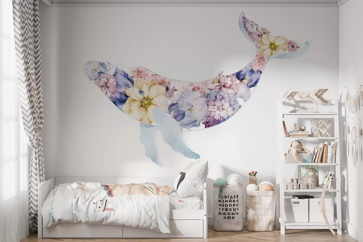 Фотошпалери Красивий кит з акварельними квітами, морські тварини, барвисті w03445