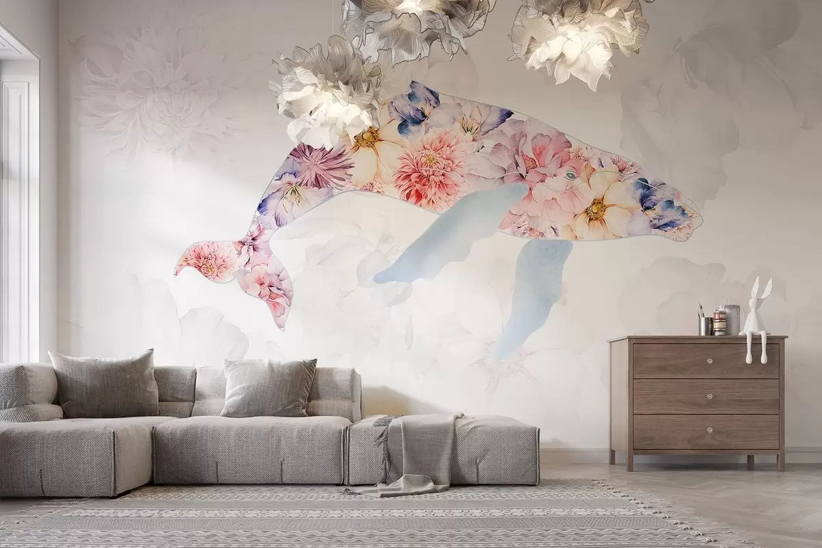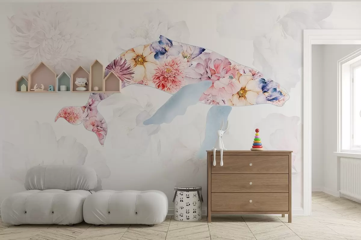 Фотошпалери Кит з акварельними квітами, океанські тварини, мінімалізм, барвистий w03446