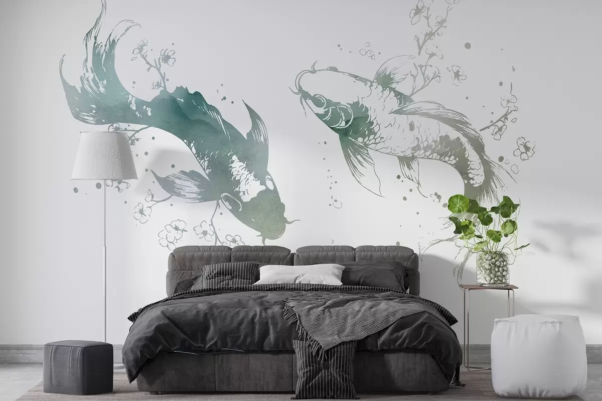 Фотошпалери Акварельні рибки, східний стиль, вишня, зелені кольори w03447v2