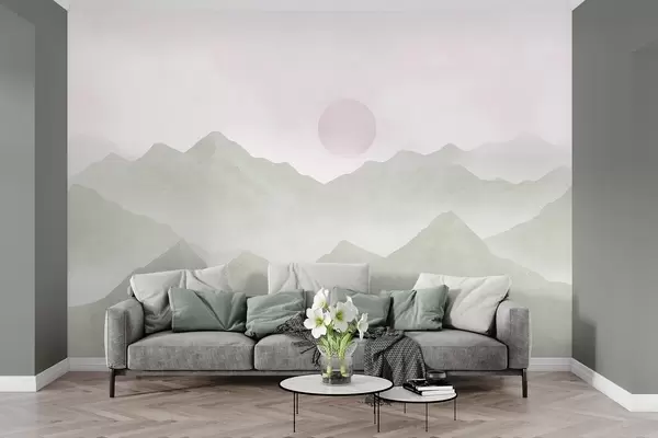 Фотошпалери Гірський пейзаж у стилі бохо, захід сонця, м'яка пастель, зелений w03547