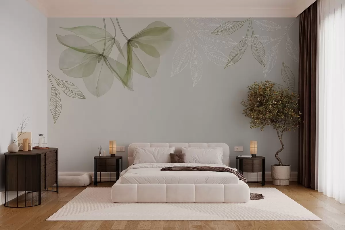Фотошпалери ніжні напівпрозорі квіти та листя у відтінках хакі w03616v2