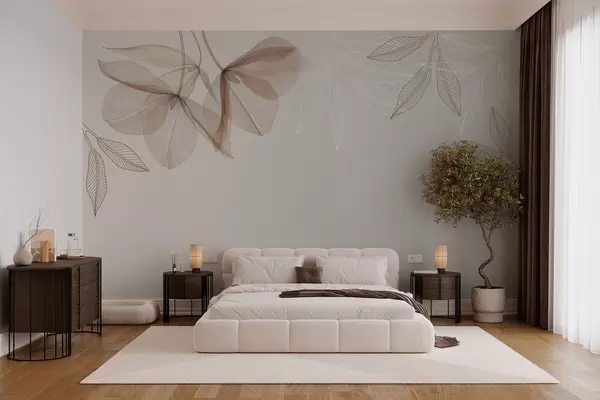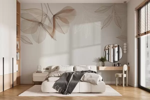 Фотошпалери ніжні напівпрозорі квіти та листя у відтінках мокко w03616v3