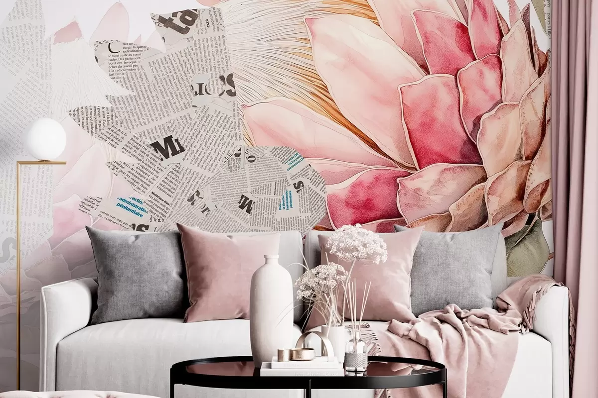 Фотошпалери Квіти протея, газетний арт, квіткові, тропічні, природні кольори w03667