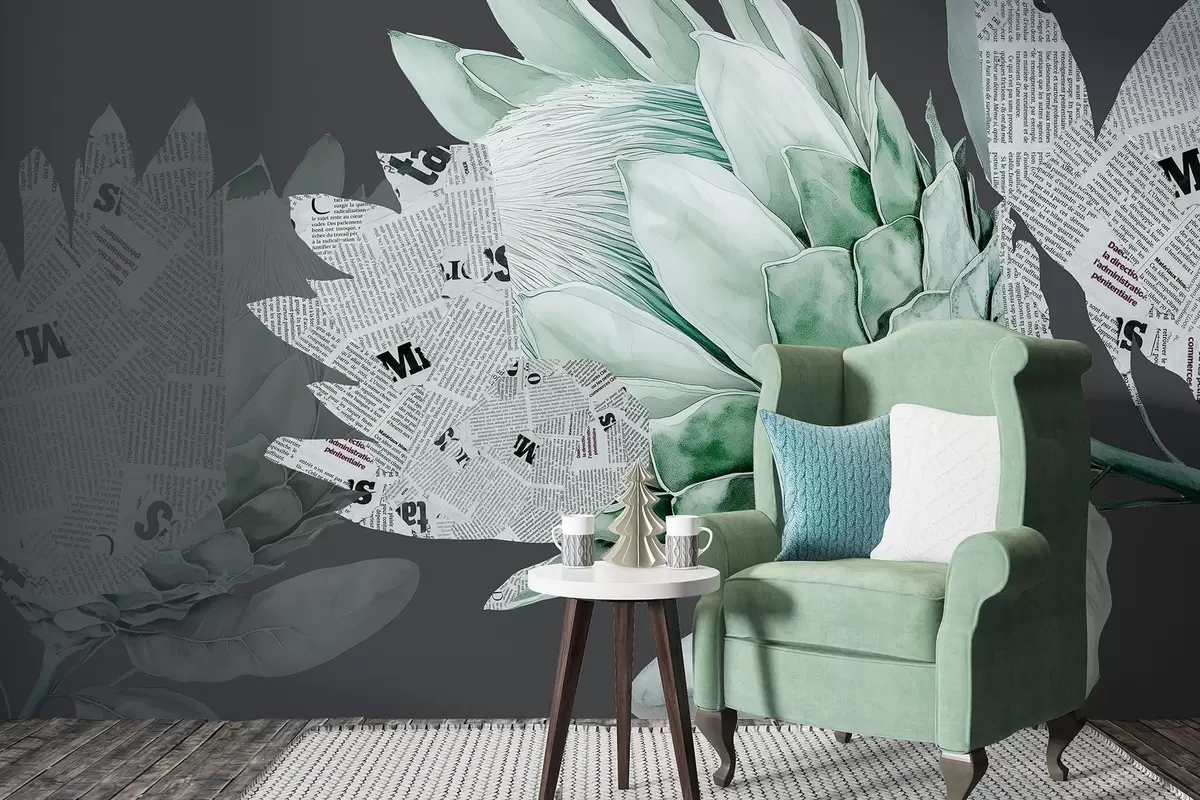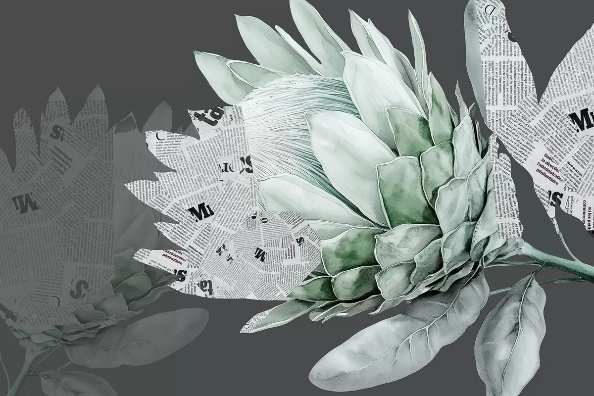 Фотошпалери Квіти протеї, газетний арт, квітковий, тропічний, темний фон, зелені кольори w03667v3