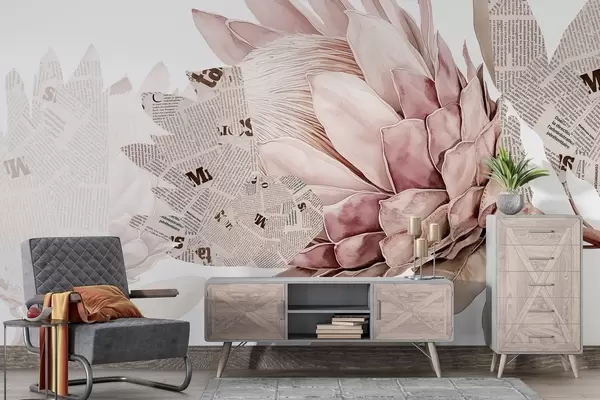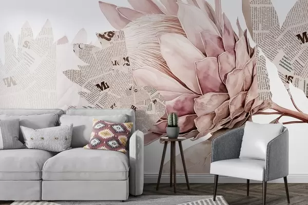 Фотошпалери Квіти протеї, газетний арт, квіткові, тропічні, пастельні бежеві кольори w03667v4