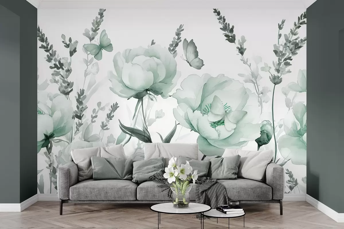 Фотошпалери Квітковий луг, півонії, лаванда, метелики, акварельний стиль, зелені кольори w03668v1