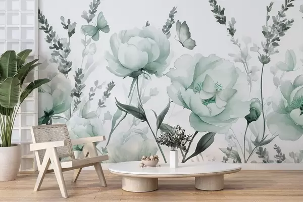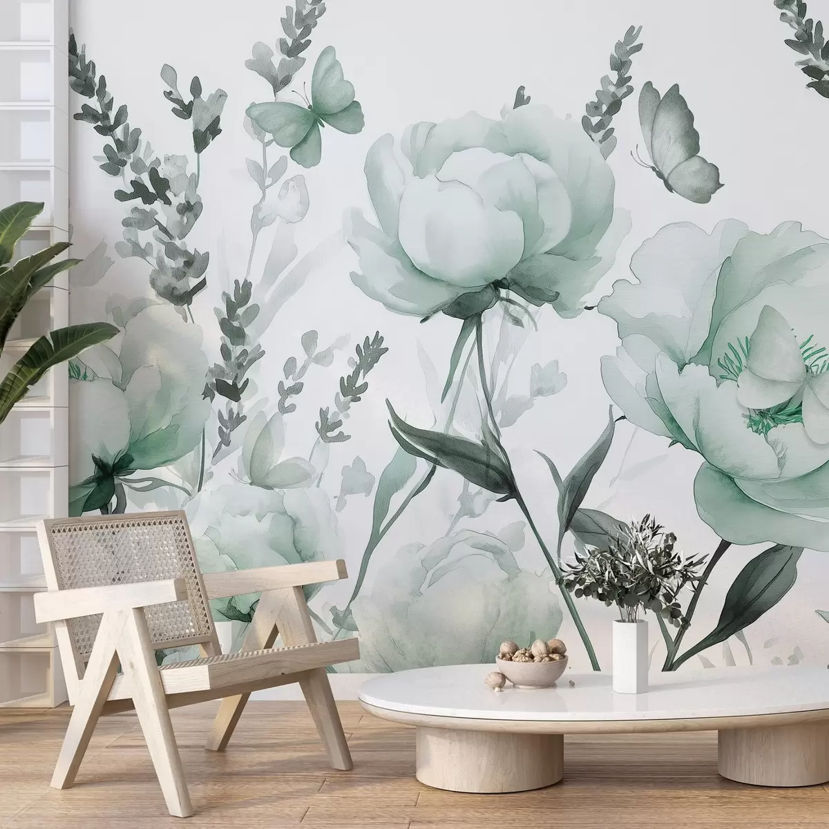 Фотошпалери Квітковий луг, півонії, лаванда, метелики, акварельний стиль, зелені кольори w03668v1