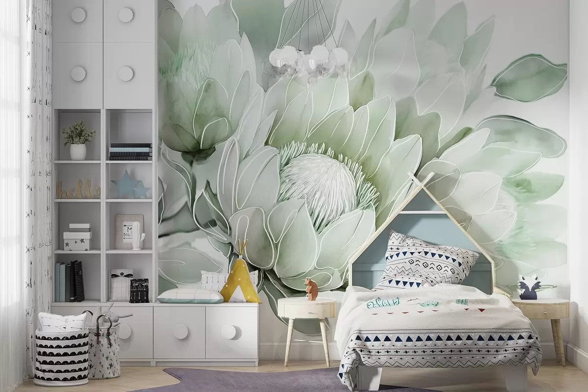 Фотошпалери Красиві квіти протея, лінійний малюнок, тропічні, зелені кольори w03669v2