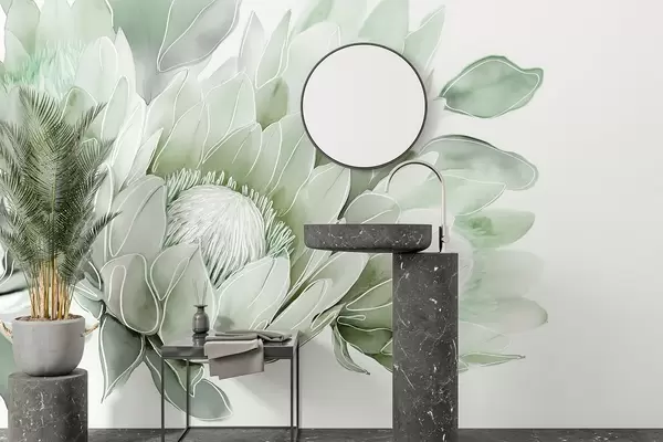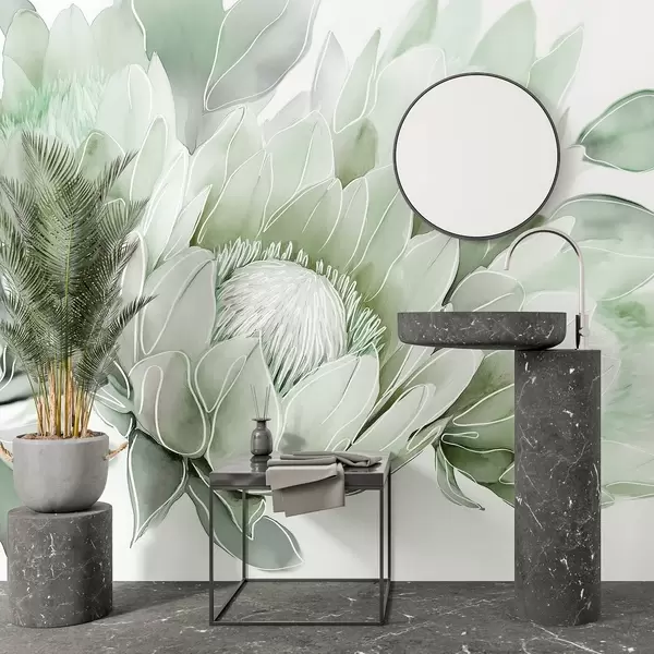 Фотошпалери Красиві квіти протея, лінійний малюнок, тропічні, зелені кольори w03669v2
