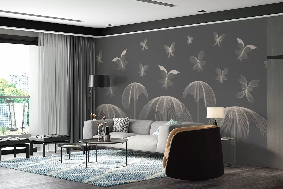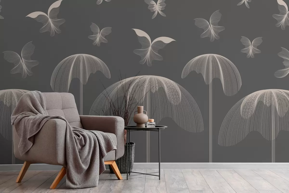 Фотошпалери мінімалістичні лінійні шпалери з метеликами та фонтанами на темно-сірому тлі w03762v1