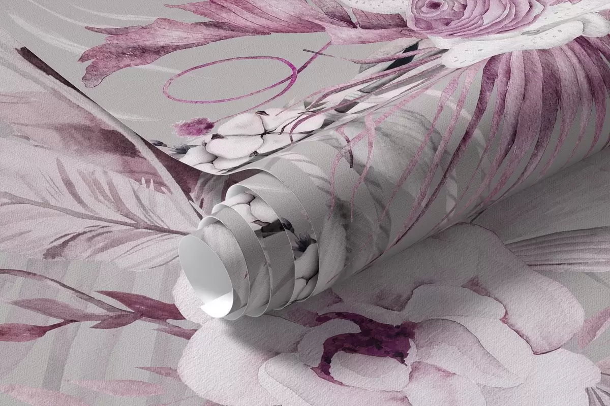 Фотошпалери Орнамент у стилі бохо з квітами півонії та птахами, акварельний стиль, рожеві кольори w03885v1