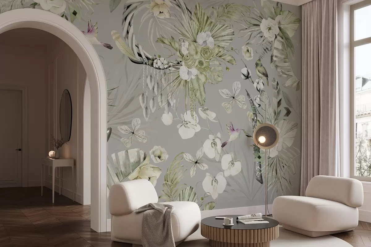 Фотошпалери Орнамент у стилі бохо з квітами півонії та птахами, акварельний стиль, зелені кольори w03885v2