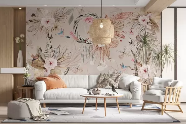 Фотошпалери Орнамент у стилі бохо з квітами півонії та птахами, акварельний стиль, м'які кольори w03885v3