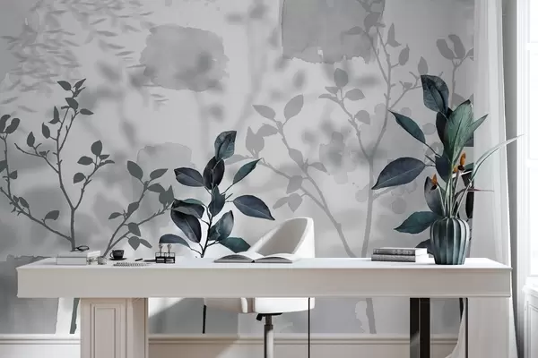 Фотошпалери Листя лимонного дерева, тіні від гілок дерев, природа, акварель, синій w03910v2