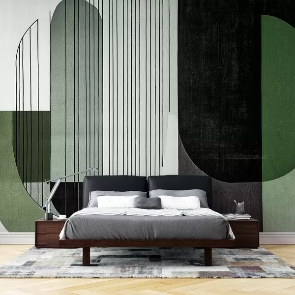 Фотошпалери сучасна абстрактна геометрична композиція з фігурами, що перетинаються, та візерунками з вертикальних ліній, тонкими лініями, що заповнюють трапеції та овали, м'якими текстильними фактурами, теплими приглушеними тонами, такими як оливково-зелений, сірий, бежевий та вугільний, тонкими ефектами прозорості між фігурами w03937v3
