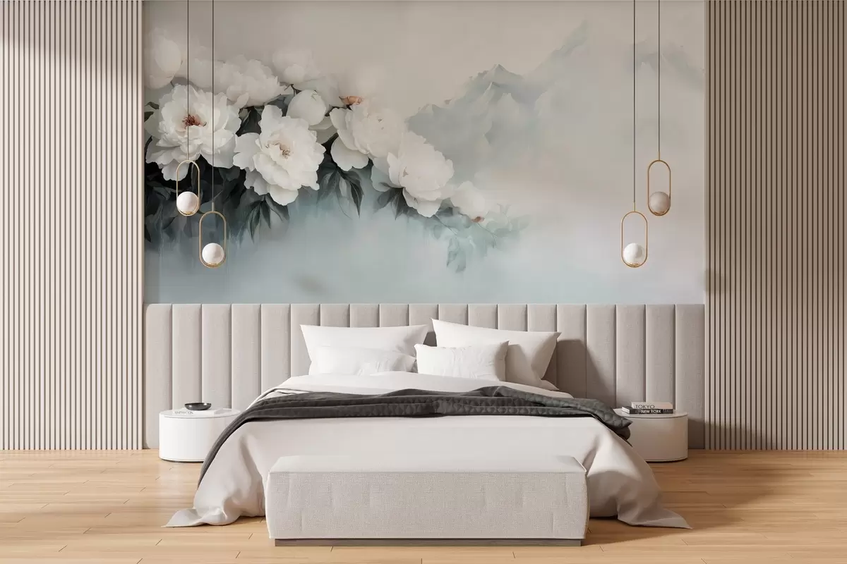 Фотошпалери мальовничі пишні білі півонії на тлі туманних гір w03965