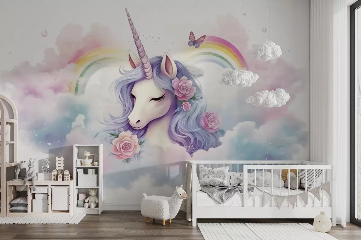 Фотошпалери Пастельний єдиноріг у хмарах з веселкою та трояндами w03990