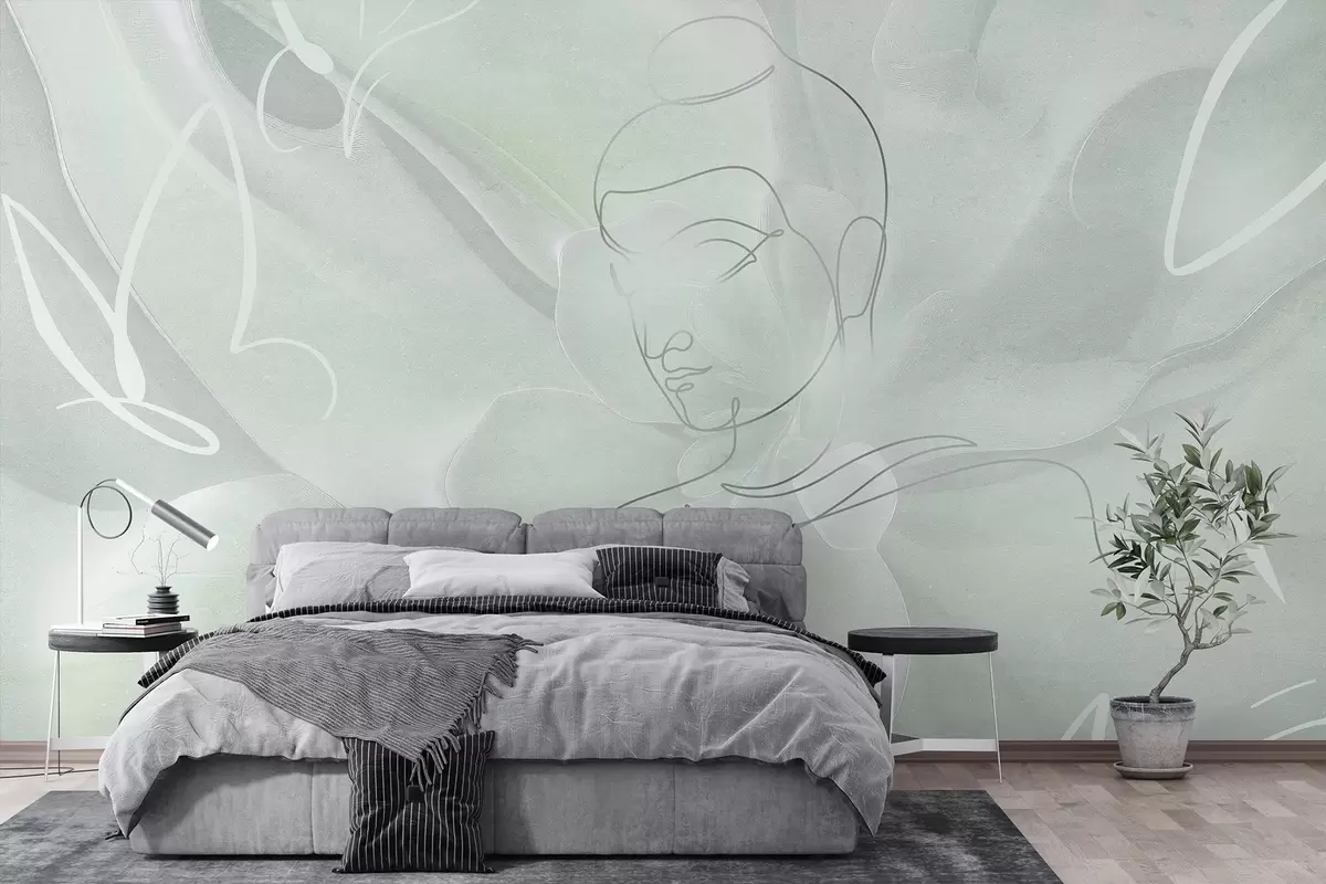 Фотошпалери Квіткова абстракція з лінійним малюнком Будди, зелені кольори w04004v3