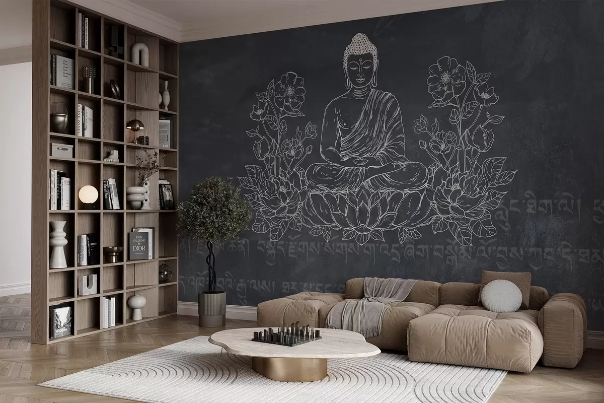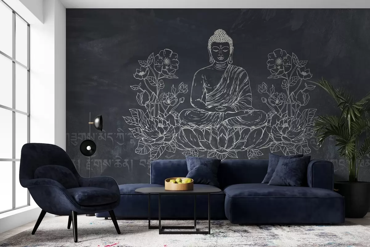 Фотошпалери Будда, що медитує з квітами лотоса, лінійне мистецтво, східний, темний фон w04008