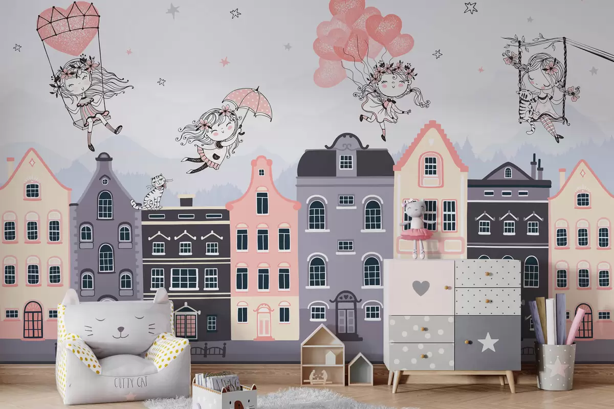 Фотошпалери Міський пейзаж з милими дівчатами w04014