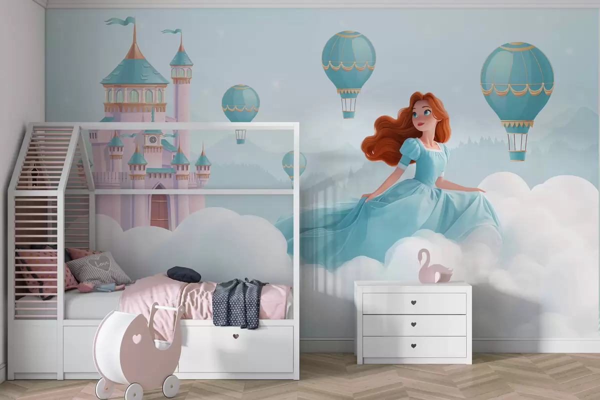 Фотошпалери Принцеса серед хмар на тлі пейзажу із замком w04015