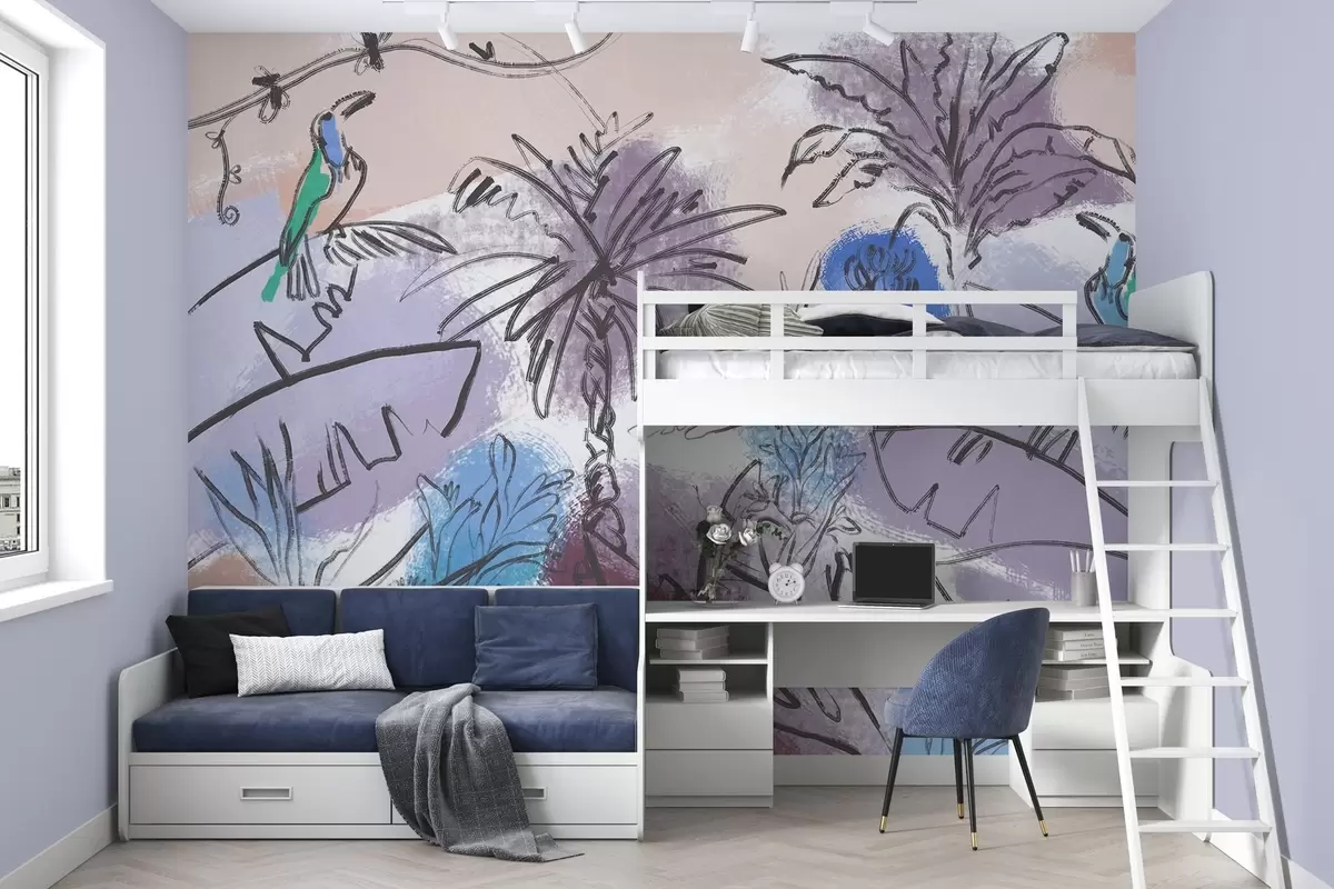 Фотошпалери Тропічний принт з блакитними квітами, мальовничими папугами w04019v2