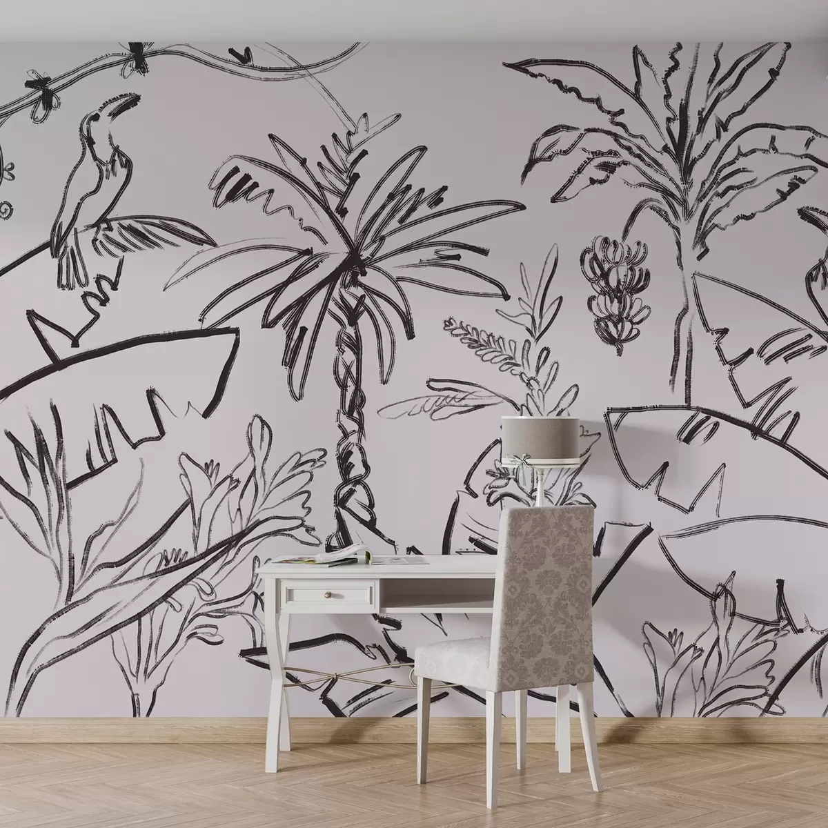 Фотошпалери Тропічний візерунок у чорному кольорі, пальми, банани, контурна графіка w04020v7