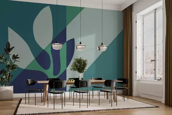 Фотошпалери абстрактна графічна рослина на тлі геометрії в синіх тонах w04028v1