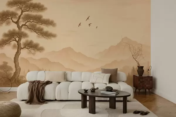 Фотошпалери панорама пагорбів з великим деревом у стилі сепія w04033