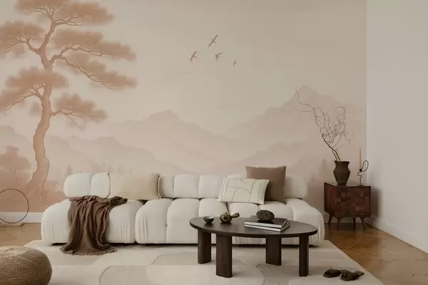 Фотошпалери панорама пагорбів з великим деревом у відтінках мокко w04033v1