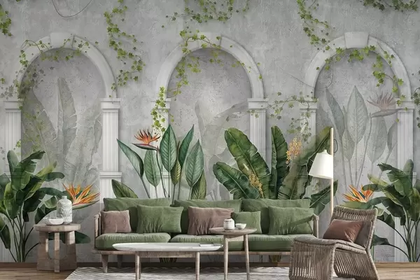 Фотошпалери Бетонна стіна з арками і тропічними рослинами, квіткові, природні кольори w04065