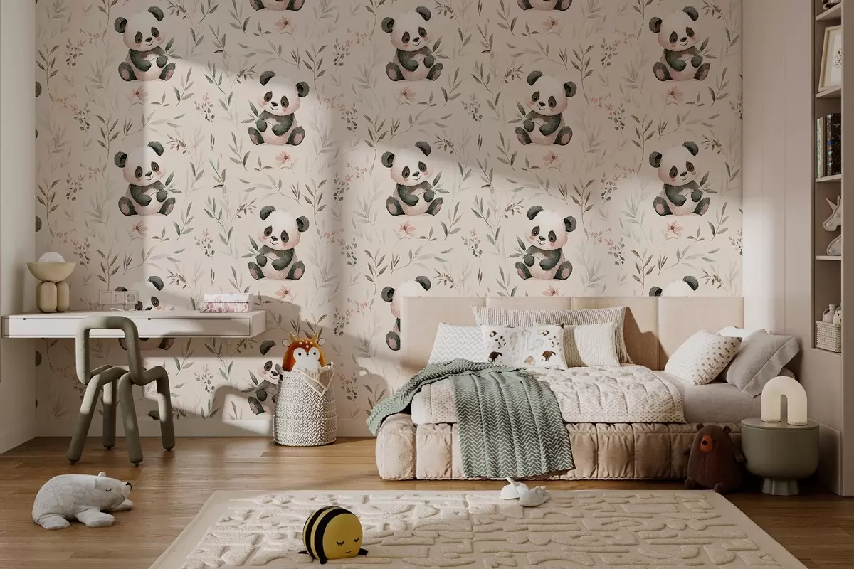 Фотошпалери милі панди в дитячому стилі серед рослин w04170
