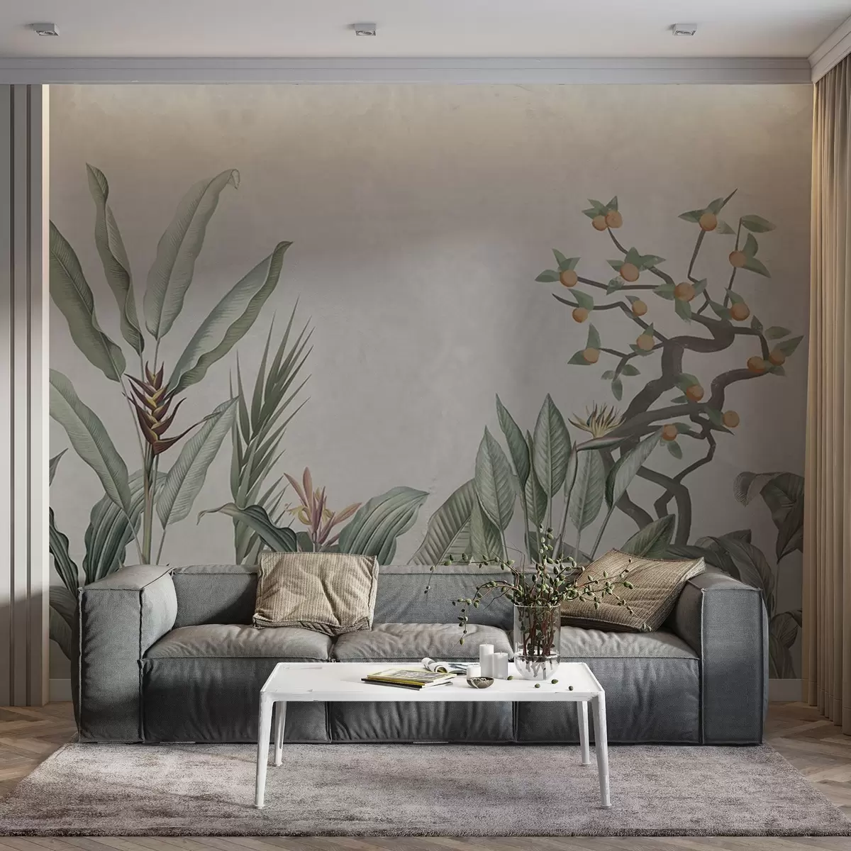 Фотошпалери Тропічна композиція з рослинами та деревом на сіруватому тлі w04201v1